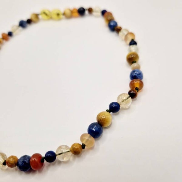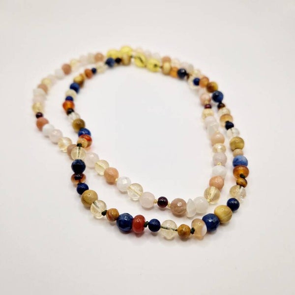 Der Schmuck wird in sorgfältiger Handarbeit gefertigt – mit Steinen (4–6 mm) und des Alters des Kindes angepasst. Die Halsketten für Kinder bis 4 Jahren werden geknüpft.